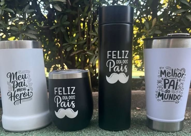 Garrafas e copos térmicos de diversas marcas e modelos são elegíveis para personalização, adaptando-se às necessidades de eventos e promoções.